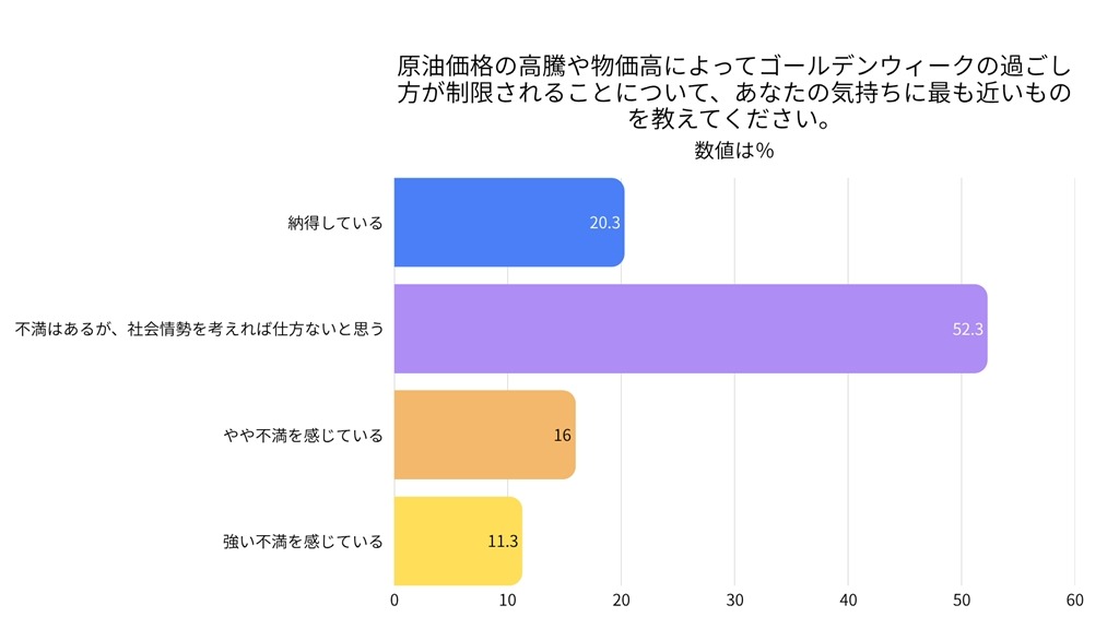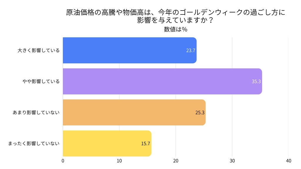 「原油価格の高騰や物価高は、今年のゴールデンウィークの過ごし方に影響を与えていますか?」の問いに、約6割の人が「影響あり」と回答した。今年の連休は、例年通り羽を伸ばせる期間ではなくなっている。