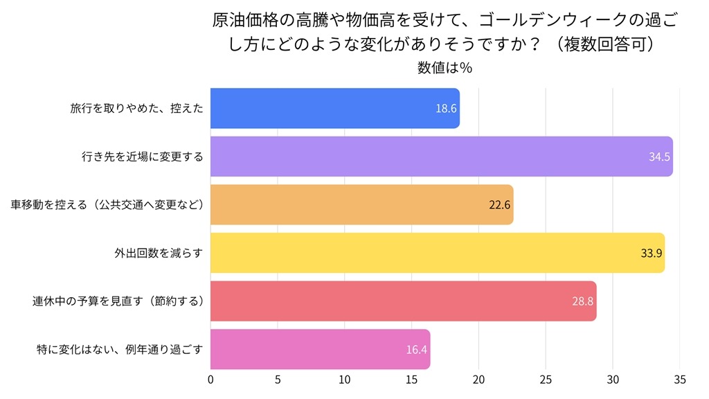 具体的な変化としては、「行き先を近場に変更する(34.5%)」が最多で、「外出回数を減らす(33.9%)」「予算を見直す(28.8%)」と続いた。遠出を完全に諦めるのではなく、移動距離や回数を削りながら連休の形を調整している様子がうかがえる。